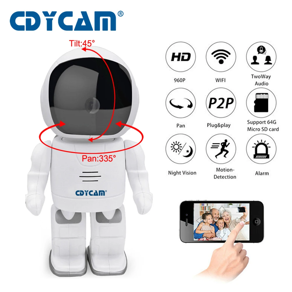 Product Details : CDYCAM Robot IP Camera HD WIFI Baby Monitor 960P 1.3MP CMOS Wireless CCTV P2P Audio Security Remote Home Cam IR Night Vision