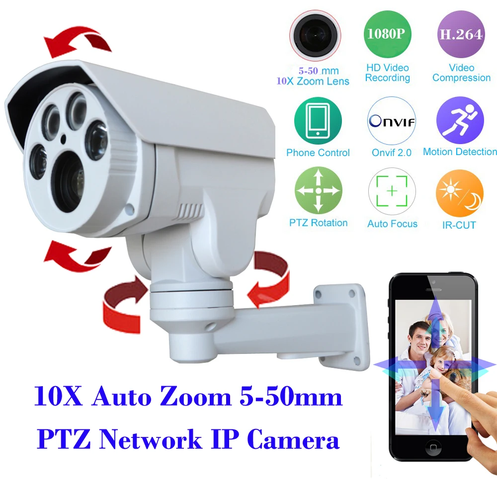 Best Seller Product Description : Onvif IP Camera HD 1080P Outdoor Weatherproof Bullet 2.0MP 10X Zoom Auto Focus lens 5-50mm Night Vision H264 CCTV PTZ IP Camera